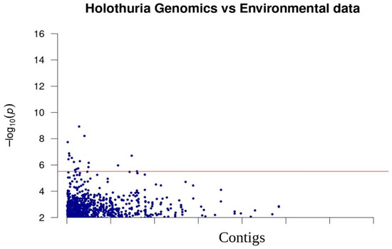 The R program LEA revealed that there is a highly significant (p < 3.09 × 10−6, after correction for multiple tests) correlation between 17 SNPs and oceanographic features (Figure 4). The snpEff program predicted that these outliers are located in intergenic regions.