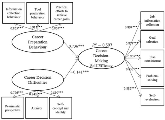 Table 4 also shows the results of Pearson’s analysis to determine the relationship between variables of interest. Career decision-making self-efficacy was significantly positively correlated with career preparation behaviour (r = 0.709, p < 0.01) and its sub-dimensions: information collection behaviour (r = 0.695, p < 0.01), tool preparation behaviour (r = 0.647, p < 0.01), and practical efforts to achieve career goals (r = 0.628, p < 0.01). In contrast, career decision-making self-efficacy was significantly negatively correlated with career decision difficulties (r = −0.230, p < 0.01) and its sub-dimensions: pessimistic perspective (r = −0.128, p < 0.05), anxiety (r = −0.222, p < 0.05), and self-concept and identity struggles (r = −0.238, p < 0.01).