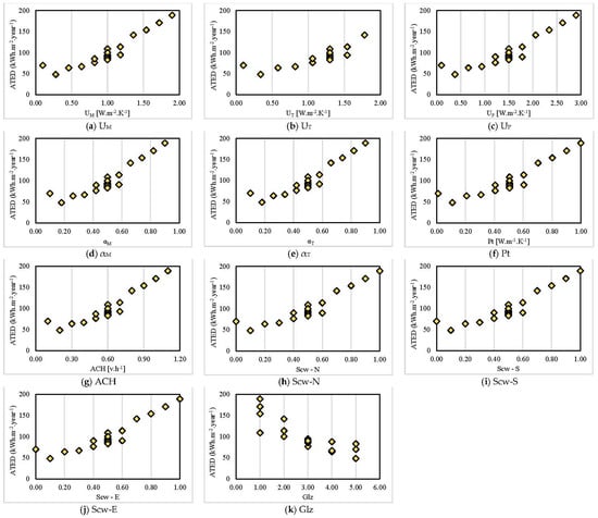 Scatter charts showing the relationship between the ATED and (a) UM. (b) UT. (c) UP. (d) αM. (e) αT. (f) Pt. (g) ACH. (h) Scw-N. (i) Scw-S. (j) Scw-E. (k) Glz.