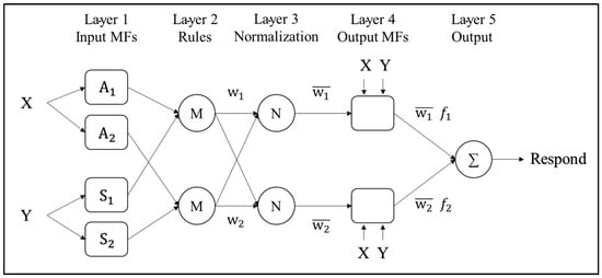 Layer 1 contains the MFs used for the fuzzification applied to the inputs. Layer 2 contains multiplier rules and releases a strength from each node. Layer 3 deals with the normalization process applied to the calculated strengths. Next, the output MFs is presented in Layer 4 by its adaptive nodes. The global response is finally released by the node in Layer 5, which sums up the previous outputs [48].
