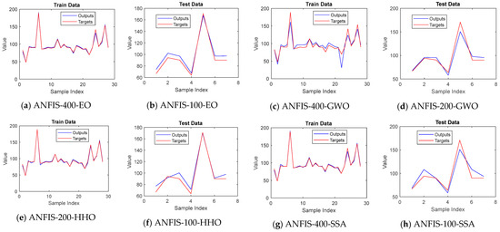 In terms of RMSE, the ANFIS-400-EO, ANFIS-400-GWO, ANFIS-200-HHO, and ANFIS-400-SSA achieved an error of 2.60, 11.14, 2.24, and 2.66, respectively, in the training phase. Likewise, the RMSE of ANFIS-100-EO, ANFIS-200-GWO, ANFIS-100-HHO, and ANFIS-100-SSA yielded 6.43, 9.01, 6.90, and 11.80 in the testing phase. As for the MAE, training values were 1.87, 7.63, 1.91, and 1.90, and testing values were 6.20, 6.75, 5.74, and 9.07.