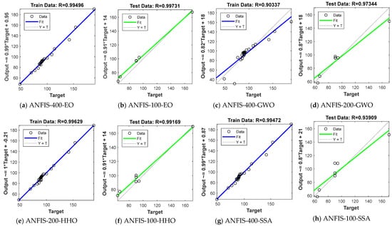 Based on Table 1, each model yielded the smallest RMSEs, i.e., the best accuracy, for different populations. The ANFIS-EO, ANFIS-GWO, ANFIS-HHO, and ANFIS-SSA with populations 400, 400, 200, and 400 gave the most accurate training, while the best testing results were obtained for populations 100, 200, 100, and 100, respectively. Therefore, the results of this models are presented and discussed in the following sections. Table 2 expresses the name of the models with reference to the selected population sizes.