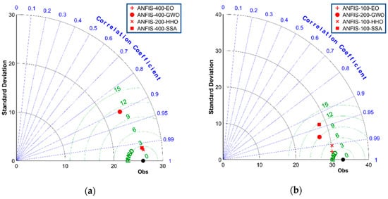 Figure 5 shows Taylor diagrams for training and testing results for a more comprehensive comparison among the models. This diagram illustrates the correlation, standard deviation, and range of RMSE (i.e., RMSD in the graph) at the same time [70]. According to part (a) that corresponds to the training data, a significant distinction can be observed between the GWO and three other metaheuristic algorithms. It is also deduced that although the HHO slightly outperformed the SSA and EO with reference to correlation and RMSD values, the EO is characterized with a lower standard deviation. As for testing phase, part (b) demonstrates the absolute superiority of the EO owing to the tangible differences in the error and correlation simultaneously. After that, HHO gave the best prediction, followed by the GWO and SSA.