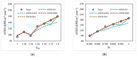In this sense, there could be important practical contribution of the offered models. They can predict the ATED for new, unseen building conditions. For instance, assuming an upcoming construction project, if the engineers have an approximation of the required thermal load in hand, it enables them to design/select the appropriate heating, ventilation, and air conditioning (HVAC) systems. Since ATED is widely affected by the dimension and characteristics of the building, another application could be modification of the building plan, dimensions, etc., to attain an environmentally efficient design. To exemplify, in Figure 6, the variation of the ATED is depicted versus the variation of two input parameters. The general trend is clearly understandable, as the ATED rises with the increase of both UM and Pt. In addition, observing the dashed lines in both figures shows that the used models (especially the ANFIS-HHO and ANFIS-EO) can nicely follow and predict this trend. The same can be created for other input parameters. Hence, performing such analysis on a large scale can be helpful to move towards sustainable energy consumption.