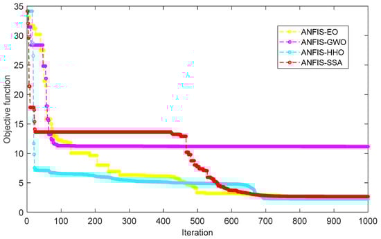 The name ANFIS-HHO represents a hybrid methodology composed of ANFIS predictor and HHO optimization algorithm. It was earlier elucidated that the HHO aims to optimize the MFPs existing in the ANFIS [64]. Constructing the hybrid model should be performed by means of some middle measures (i.e., equations). On the other hand, optimization by metaheuristic algorithms is done inchmeal over a certain number of iterations [65,66]. Thus, an evaluation criterion is required to monitor the results of each iteration. The RMSE indicator is defined as the cost function (i.e., objective function) to show the accuracy of the optimized ANFIS. It will be shown that the assigned metaheuristic algorithm is able to reduce the RMSE step by step, which indicates improving the training of ANFIS [67].
