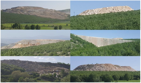 During the production of block marble in marble quarries, up to 50% of marble waste may form in the form of rubble and flat stone [6]. Rubbles in the quarry are generally amorphous wastes smaller in size than blocks resulting from faults during production and defects (cracks, faults, etc.). Flat stones are the lower, upper and side parts of the marble blocks, removed from the block during the cutting process to obtain blocks of certain dimensions. A very small portion of these wastes, which are in various sizes, are used as recycled material (in aggregate production) and filling material, and a large portion is generally piled up around the quarry [7]. These wastes accumulating around the quarry cause visual pollution by causing both the formation of masonry hills and additional connection roads (Figure 1). In addition, with the increase in accumulation areas and therefore the number of connection roads, vegetation is gradually being destroyed.