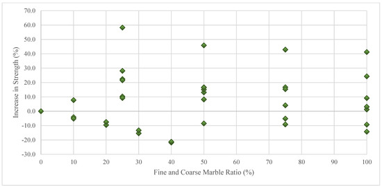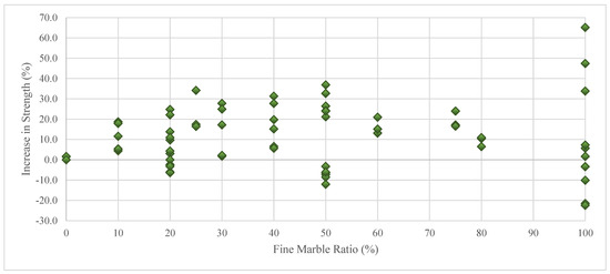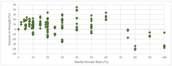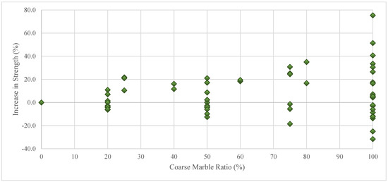 In this part of the study, the effects of replacing regular coarse aggregate with coarse marble aggregate in various proportions on concrete compressive strength were investigated. In this context, a total of 93 concrete compressive strength tests compiled from the literature were used [20,42,43,44,45,46,47]. Figure 11 indicates that replacing the coarse aggregates with coarse marble aggregates can affect the compressive strength of concrete positively (increases up to 75%) or negatively (decreases up to 32%). The most likely reason for these different effects is the strength differences between the aggregates used in the experiments. However, even if the negative effects of marble aggregates are taken into account, replacements of regular coarse aggregates with marble aggregates of up to 20% and 50% are responsible for maximum decreases of only 6.3% and 12.6%, respectively, in the compressive strength. This shows that coarse marble aggregates can be consumed in high quantities in concrete.
