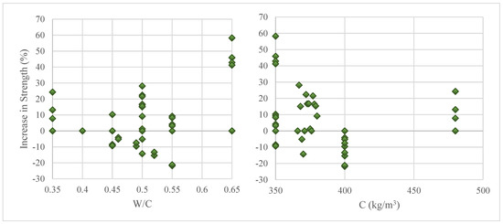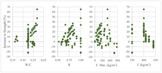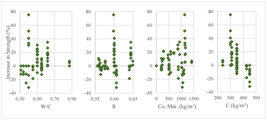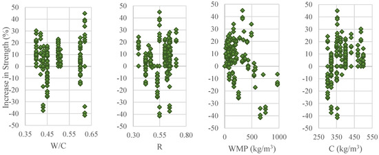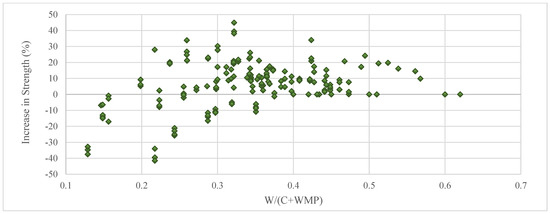 To be able to make comprehensive evaluations and handle all these cases, the ratio of the mixing water to the total mass of cement and marble powder [W/(C + WMP)] should be considered (Figure 3). This figure portrays the positive effects of increasing the W/(C + WMP) ratio on the concrete compressive strength. As a matter of fact, only 6% of 152 samples with W/(C + WMP) ratios greater than 0.30 experienced reductions in compressive strength, whereas the compressive strength values of 52% of 58 samples with W/(C + WMP) ratios below 0.30 were reduced rather than being increased with the use of marble powder. These conclusions clearly depict that the marble powder ratio cannot be considered alone and this ratio can only yield to meaningful results if considered together with the W/(C + WMP) ratio. In this regard, if the W/(C + WMP) ratio remains above 0.36, marble dust replacement ratios of up to 20% become tolerable. Similarly, by allowing a maximum decrease of 11% in the concrete compressive strength, substitution ratios of up to 50% become tolerable as long as the W/(C + WMP) ratio is equal to at least 0.30.