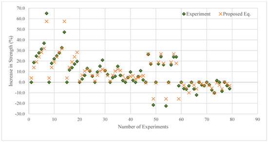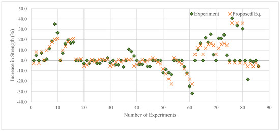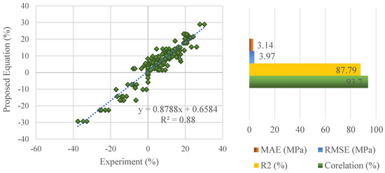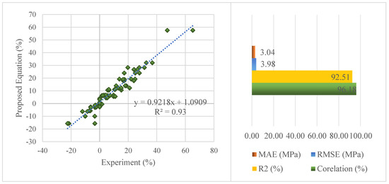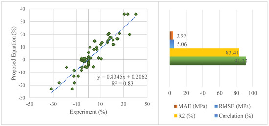 The comparison of the experimental results with the results estimated by the proposed equation is presented in Figure 14. In Figure 14, there is a high correlation between the estimated and experimental results, just like the statistical results.