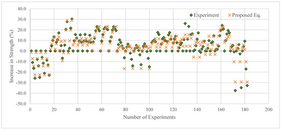 The comparison of the experimental results of concrete compressive strength changes with the results estimated by the proposed equation is presented in Figure 6, which illustrates a high correlation between the estimation results and the experimental results, just like the statistical results.