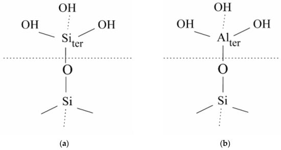 The terminal oxygen in (a) Siter-O-Si and (b) Alter-O-Si before and after protonation.