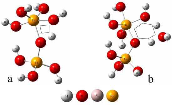 The most important aspect of a reaction pathway is determining the transition state complex, which has no stability in time and has no real finite concentration, by definition. Recent descriptions of quartz and aluminosilicate mineral dissolution included different transition state complexes during the hydrolysis of Al-O-Si and Si-O-Si linkage on the mineral surface [,]. However, the configurations of the transition state complexes were not discussed. In this paper, the four- and six-membered ring transition state complexes for the hydrolysis reaction of aluminosilicate are presented. The four-membered ring configuration contained an Si and O atom in the reaction center of Siter-O, and H and O from a water molecule (Figure 2a), whereas the addition of H and O from in the six-membered ring configuration (Figure 2b) came from another water molecule.
