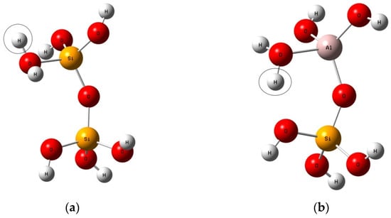 To model dissolution process for the surface reaction sites above, the following six reactions were studied. Equations (1) and (2) represent the Siter-O-Si (Figure 3a) and Alter-O-Si (Figure 3b) sites without protonated terminal oxygen, respectively. With the breakage of the Siter-O or Alter-O bond, the Si and Al species are extracted from the reaction sites as H4SiO4 and [Al(OH)4]−, respectively. Equations (3) and (4) represent the Siter-O-Si (Figure 4a), and Alter-O-Si (Figure 4b) sites with protonated terminal oxygen, respectively (Figure 3). After the hydrolysis reaction, the protonated monosilicic acid molecule releases from the Siter-O-Si, and the [Al(OH)3·H2O] forms from the Alter-O-Si site. The bridge oxygen in the surface sites becomes the terminal oxygen after reaction. The charge of the molecular cluster in the Equations (1)–(4) is retained during calculation.