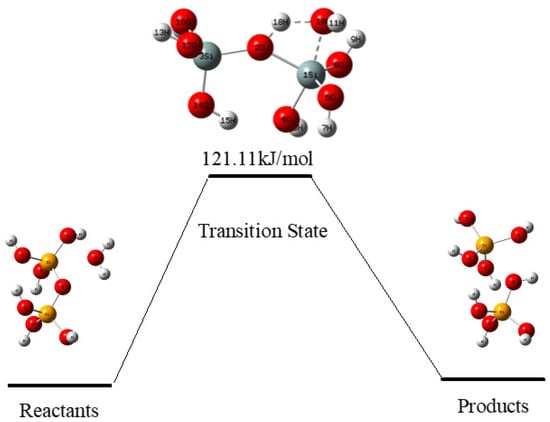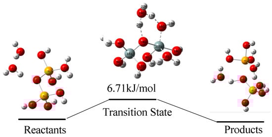 Figure 9 and Table 3 show the energy profile and hydrolysis mechanism of Alter-O-Si with protonated terminal oxygen. The barrier height was −0.86 kJ/mol. The negative activation energy suggested that the intermediate existed with a lower energy than the transition state []. The two reactants formed an intermediate with lower energy, due to the strong hydrogen bond before the transition state formed. These results led to the same conclusion, that the protonated site was easier to hydrolyze than the unprotonated site.