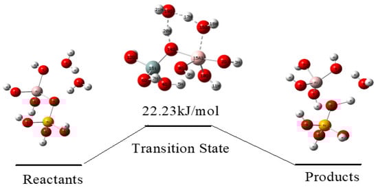 The energy profiles of hydrolysis reaction at Alter-O-Si site are shown in Figure 8 and Table 3. The barrier height for the Alter-O-Si without protonation was 22.23 kJ/mol. The results suggest that the Alter-O-Si site was easier to hydrolyze than the Siter-O-Si site. This may be attributed to the higher bond energy and symmetry of Siter-O-Si, which needed higher energy to break.