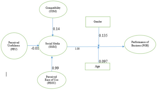 TAM components, that is PEU and PEOU, entail several other beliefs such as intention and attitude. A number of proposed adoption models have used TAM as a benchmark in the past and are currently doing so. Based on TAM, many other adoption models have been framed subsequently [26]. With changes in the technological advancements over time, it is necessary to propose other demographic, technological, and social factors towards the adoption of SMM in SMEs. In this regard, this work has employed some of the technology adoption models, for example, TAM (PEU and PEOU) and the Innovation Diffusion Theory (IDT) that was proposed by [27] supported by [28]. In the IDT model, a factor of compatibility (COM) is borrowed. “Compatibility” is the level at which an innovation is perceived as dependable with the existing values, past experiences, and needs of those that intend to use it [27]. The study chose to test only a single component (compatibility) of IDT based on work that was done by [29] which points out that, despite the fact that IDT includes more extensive elements, accumulating empirical data have revealed that TAM offers a superior mechanism for describing user acceptance, recognition, and behavior. In other words, factors from TAM (PEU and PEOU) and IDT (COM) have been considered in this study as important predictors of SMM [30,31]. When employees and managers of the SMEs are to accept the communication concerning SMM from relevant channels over an unspecified period of time, they soon realize that indeed this technology aligns well with their previous experience and daily practices with the devices that they already possess, thus they feel compatible to adopt and perhaps implement it in their businesses [13,24]. Uganda, being a developing country with an economy that is struggling to keep afloat, users ever keep themselves aware and cautious of the cost of any innovation that comes onto the market [32,33]. If the adoption and subsequent use of SMM is not affordable relative to the already available practices, there will be a significant hesitation by the SMEs in the adoption of SMM [13,14,34,35]. When SMEs adopt the use of SMM, it is well understood that they will incur lesser costs as compared to other means of marketing. The SMM mechanisms will reach a wider customer base of the SMEs [36,37,38]. The studies that were cited contend that perceived usefulness, perceived ease of use (TAM model), and compatibility (IDT model) would significantly (positively or negatively) impact on the SMEs to adopt SMM [13]. The studies by Wang, Pauleen, and Zhang (2016) [39] and Chatterjee, et al. (2021) [34] have indicated that the use of SMM mechanisms by SMEs has a significantly positive effect on the enhancement of SME businesses.