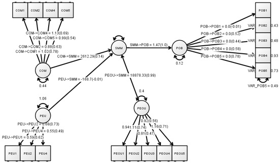 In this study, the Fronell–Larcker Criterion [84] is employed along with the heterotrait-monotrait (HTMT) ratio of correlation to test for discriminant validity of the measurement model. As per this criterion, the condition for achieving discriminant validity is that the square root of the average variance that is extracted by a latent variable/construct should be greater than the correlation between the latent variable and any other latent variables. The averages (COM_AV, PEU_AV, PEOU_AV, and POB_AV) for each latent variable were computed using an appropriate procedure in SPSS. However, the main interest here is in the values of the Pearson correlation together with the asterisk (*) which indicates the significance level, Table 3. For the HTMT criterion [85], it is able to obtain greater specificity and sensitivity rates (97% to 99%) compared to the cross-loadings criterion (0.00%) and Fornell–Lacker (20.82%), according to a Monte Carlo simulation research that was used to demonstrate the method’s superior performance Table 4.
