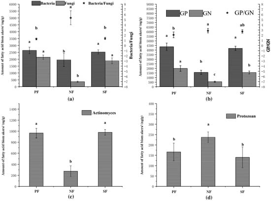 We used the PLFA marker amount (ng/g) to represent the microbial biomass. The total bacterial and fungal biomass in PF and SF was similar, but both were significantly higher than in NF (Figure 3a). Additionally, the Gram-positive, Gram-negative (Figure 3b) and actinomycetes (Figure 3c) in PF and SF were significantly higher than that in NF. This may be correlated with the soil water content and soil nutrient. The microbial community composition was influenced by hydrological conditions through soil moisture, aeration and vegetation type. The key factor of soil microbial community is significantly related to the functional potential of soil microorganisms []. Soil water content may affect the transcription and activity of microorganisms, which may lead to changes in soil microbial communities [,]. Our results were consistent with many studies [,]. However, some studies produced results that were not consistent with our own [,,]. This may be because of the season in which we carried out this research, and other factors (e.g., climate and temperature) which could lead to differences in soil microbial composition. Therefore, future studies should take seasonal factors into account.