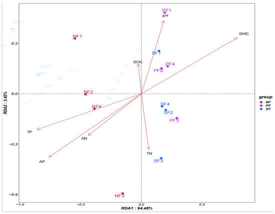 Redundancy analysis (RDA) conducted with the soil microbial PLFA-derived data and soil physicochemical properties of the three different wetland types in the Sanjiang Plain. SWC: Soil Water Content; SOC: Soil Organic Carbon; TN: Total Nitrogen; AN: Available Nitrogen; TP: Total Phosphorus; AP: Available Phosphorus; PF: permanently flooded wetlands; NF: non-flooded wetlands; SF: seasonally flooded wetlands.