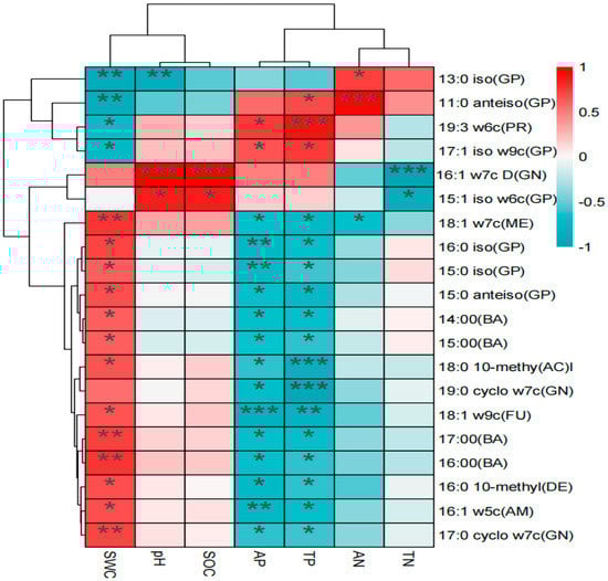 Heat map showing correlations between individual PLFA biomarkers and soil physicochemical properties in the three wetlands. Statistical significance is given as * p < 0.05, ** p < 0.01, *** p < 0.001. AN: available nitrogen, AP: available phosphorous, TP: total phosphorus, TN: total nitrogen, SOC: soil organic carbon, SWC: Soil Water Content.