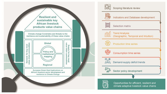 Africa, the most vulnerable continent to climatic shocks worldwide, has prioritised the agricultural sector’s adaptation to climate [27]. Severe droughts compound the effects, especially for the livestock sector, which is mainly extensive and relies on rainfed feeds. Increasing resilience and the capacity of the sector to thrive in such an environment coupled with competition for resources becomes essential. In the spirit of green transition, the sector, if well planned, is a source of renewable energy through biogas production. FAO explains how African agriculture is becoming more sensitive to climate change, resulting in an increased demand for climate-smart agricultural practices for green transitions across Africa [28,29].