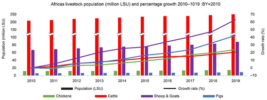 Africa’s crucial livestock population (Million LSU) and percentage growth from 2010–1019 (Source: Authors’ calculations based on FAO 2020 statistics on livestock population).