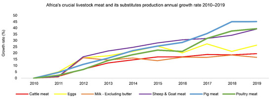 Africa’s crucial livestock meat and its substitutes production from 2010–2019 (Source: Authors’ calculations based on FAO 2020 statistics on livestock population).