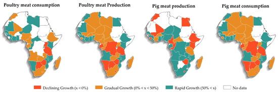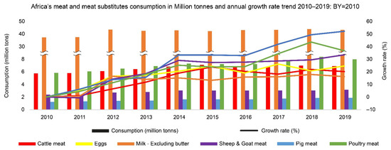 Africa is experiencing an unprecedented demand for livestock-derived products, characterised by a fast-growing market, as portrayed by consumption tendencies, which are part of an exponential trend. This can be associated with the fast-growing production trend, as presented in Section 3.2 above.