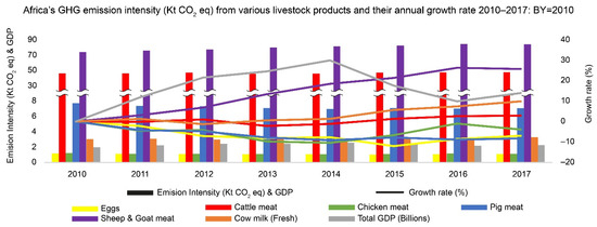 African livestock products GHG emission intensities (Kt CO2 eq) and their annual growth rate trends (Source: Authors’ calculations based on FAO 2020 statistics).
