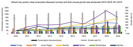 Between 2010–2019, African poultry meat consumption grew by 37 per cent. Previous studies had 2050 projections at 61 per cent with 2000 as the baseline, but under business as usual, growth based on our calculations will be surpassed by 2030 [81]. Over the period under study, some of the critical poultry consumers grew fivefold, as presented in Figure 5 above. Per capita, poultry consumption between 2010–2019 was highest in South Africa, with an annual average of 34.45 kg, followed by Morocco and Congo, which had a yearly average of 19.7 kg and 15.8 kg, respectively. The annual growth for South Africa and Morocco has been increasing gradually over the period, where Congo increased from 8.8 kg to 22 kg. Angola had a yearly average of 13.01 kg, which grew steadily until 2017 and started declining.