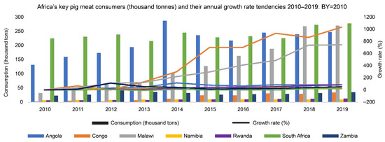 A scenario is already presenting itself with China and other allies from the west positioning themselves to tap into the potential arising from the new markets. Most consumers are in emerging economies, which indicates how the middle class will dictate meat consumption patterns across Africa in the future. Figure 8 and Figure 9 show those countries where poultry and pig meat were most consumed over the last ten years and their growth over time.