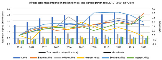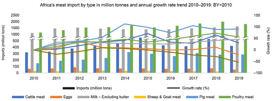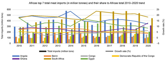 As discussed in Section 3.3 above, poultry and pig meat are the most-consumed products; we look further at their trade tendencies, where the supply–demand deficit for pig and poultry-derived meat products grew exponentially. Between 2010 and 2020, Africa’s total meat imports were approximately 2.55 million tonnes. Moreover, meat imports almost doubled, increasing from 1.6 million to 2.43 million tonnes, as shown in Figure 10 below.