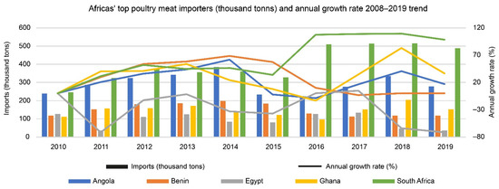 Africa’s top chicken meat importers, 2008–2019 trend (Source: Authors’ calculations based on FAO 2020 statistics on trade).