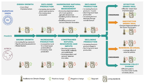 If the above findings on declining production across Europe and triggering production elsewhere globally are anything to go by, then Africa stands the most excellent chance to gain. According to FAO, Africa has 60 per cent of the world’s uncultivated arable land [57,58]. However, most of this uncultivated arable land is under grasslands and forests; thus, a global shift in production is more likely to induce high-risk direct land use change, undermining the environmental benefits aspirated under the EGD [41]. This complicates the green transition process that is predicated on the sustainable implementation of practices. Some of the implementable measures include additionality measures, production in abandoned lands, sequential cropping, agroforestry, eco schemes and silvopastoral systems to promote environmental stewardship and ensure feed production can be met simultaneously.
