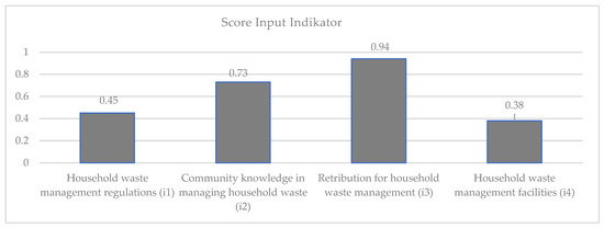 Evaluation of the implementation of household waste management using the Household Waste Control Index (HWCI) analysis is influenced by Input Indicators, Process Indicators, and Output Indicators. Based on the household waste control index, the accumulated score of the input indicator (Σi) of Bekasi City is 2.38, with a maximum score of 4.00. This indicates that the input sub-indicator achievement has not been maximized. Based on the evaluation of the Household Waste Control Index in 12 districts in Bekasi City, it is known that there are five districts (42%) that have input indicator scores above the input indicator scores of Bekasi City, namely Bekasi Selatan, Jatisampurna, Pondokmelati, Medansatria, and Bantargebang. Meanwhile, in seven other districts (58%), namely Bekasi Timur, Bekasi Barat, Pondokgede, Rawalumbu, Bekasi Utara, Mustikajaya, and Jatiasih, the results of the input indicator scores are below the input indicator scores of Bekasi City. In order to support the improvement of the household waste control index, of course, efforts are needed to increase the sub-indicators that affect the achievement of input indicator scores by accelerating the input sub-indicators which, scientifically based on research, affect the effectiveness and success of the implementation of household waste management, including: with household waste management at the community scale (i1) [26,27,28,29,30], public knowledge related to household waste management (i2) [31,32,33,34], household waste management fees (i3) [17,26,35] and household waste management facilities at the community scale (i4) [36,37,38].
