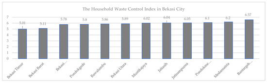 Meanwhile, Bantargebang District, based on the study’s results, had the highest household waste control score of 6.57, included in the good category. The household waste control score in the Bantargebang district is the highest compared to 12 other districts in the Bekasi City area. It has the highest score for calculating input and process indicators, so the Bantargebang district index calculation is above the household waste control index at the Bekasi City level (5.86). The high household waste control score in the Bantargebang district is possible because the location of the Bantargebang district is close to the final processing site in Sumurbatu. Based on the analysis of the input and process indicators, the condition reflects the community’s level of motivation and awareness to manage household waste in their respective homes.