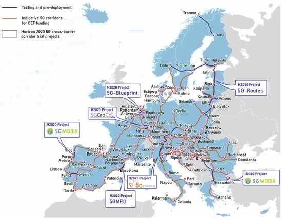 Part of the CEF and the 5G-PPP constitutes a series of projects, including 5G-ROUTES, 5G-CARMEN, 5G-CROCO, 5G-Mobix, 5GMED, 5GBlueprint, and 5GRail, which are all expected to work as catalysts for cross-border, stable 5G connectivity. These projects have a wide set of objectives, such as the creation of high-capacity networks, including uninterrupted 5G system coverage across all major transport corridors within Europe (Figure 1).