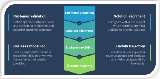 In the 5G-ROUTES project [], an adaptation of the lean-startup methodology originally proposed by Eric Ries [] has been used to help assess and support the commercialization potential of use cases of 5G technologies in the Baltic Region. The lean-startup methodology’s foundation is that entrepreneurs should develop products that consumers have already demonstrated that they desire, while their utility is validated through the collection and analysis of data. This methodology has since been embraced by EU projects, in which an adaptation of the overall framework is utilized to create customer-focused, founder-driven, and investor-oriented commercialization plans for project outcomes.