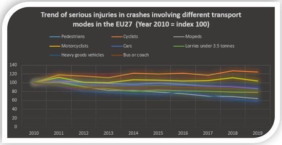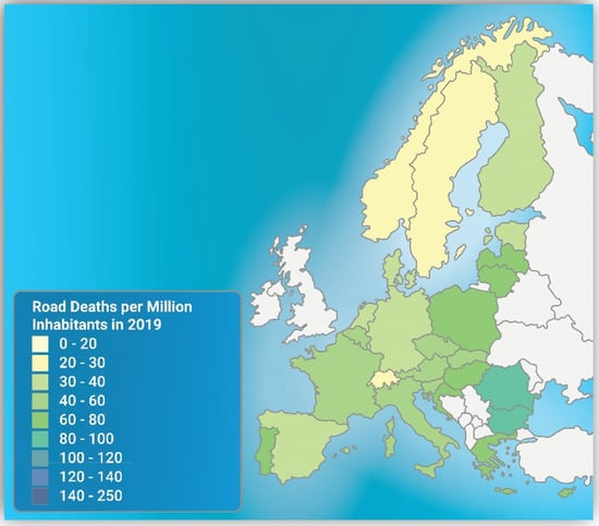 With the ever-growing size of road networks and the accumulation of the world population in urban environments, road safety is becoming vastly important to societies and policymakers worldwide. With an estimated number of 18,800 fatalities from road accidents in the EU in 2020 and the EC’s Zero Vision for zero accidents in 2050, a considerable gap must be bridged by EU Member States (MS) to alleviate the road accident-related suffering of citizens. Moreover, aside from fatalities, there is also an estimation that every traffic-related death corresponds to four-permanently disabling injuries, eight serious injuries, and fifty minor injuries []. Despite the current size of this problem, there have been positive developments over the past few years, with road accidents in EU MS being estimated to be decreasing (see Figure 4 for road deaths per million Inhabitants in 2019 in the EU), with an overall 36% decrease from 2010 to 2020 and a 17% decrease from 2019 to 2020 [].