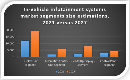 Lately, a trend in OEMs has been to increase the size of display units, which are likely to accommodate complex control and multimedia features over the next few years. Likewise, navigation and control panels are increasingly included in low-cost vehicles as well. An interesting emerging technology is the installation of a heads-up display, which is likely to be integrated into parts of the vehicle wherein the driver can drive and also pay attention to the information provided at the same time. In Figure 5, some information on the expected size of the infotainment market is given according to the component type.