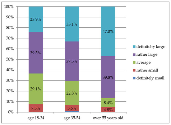The older the respondents, the higher the percentage of those willing to live in close proximity to the forest, up to 20 m. In the group of 18–34-years-old respondents, the percentage of those who valued this was 34.3%, while in the group of those 35–54-years-old, this percentage was 46.3%, and among older respondents, it was 65% (Figure 8).
