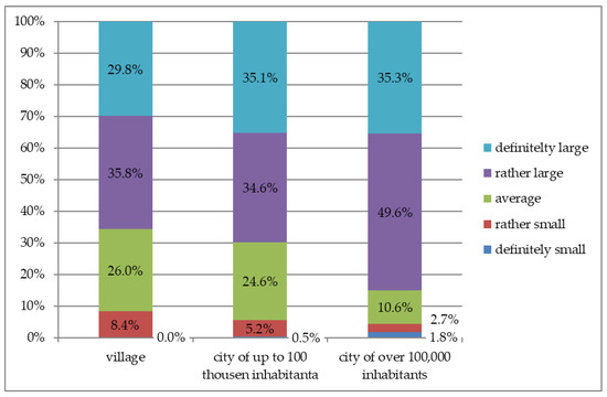 With the urbanisation of spaces, the respondents’ belief that this factor is quite important (rather important and definitely important) for the attractiveness of the plot increased. In the group of rural/settlement residents, the percentage of those believing this was a total of 65.6%, while in the group of respondents from cities with up to 100,000 residents, it was 69.7%, and in the group of respondents from larger cities, it was 84.9% (Figure 6).