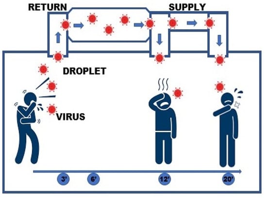 The spreading of SARS-CoV-2 is faster in an indoor area with an HVAC (Heating, Ventilating, and Air Conditioning) system. The SARS-CoV-2-contained aerosol can remain floating in the air for up to eight hours; thus, it can circulate in the vent, ductwork, and inside the room. Several studies have been conducted to determine how HVAC systems influence the proliferation of microorganisms, such as viruses, in occupied spaces []. Figure 1 illustrates the risk potential of airborne transmission of the SARS-CoV-2 virus in a room equipped with an HVAC system. If the person infected with SARS-CoV-2 is coughing in one area indoors, another person within the building that shares the same HVAC system is more likely to be infected.