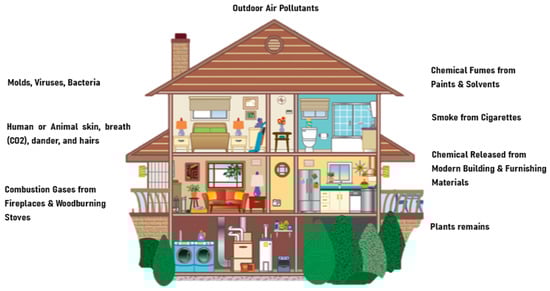 Compared to outdoor PM, indoor PM contains common and distinctive contaminants. For example, indoor PM can form pollutants like emissions from industrial pollutants. These hazardous material pollutants are the sources of Indoor Air Pollution (IAP). There are classifications such as chemical, physical, biological, and radiological, and the pollutants can be categorized based on their nature. Solid materials such as dust and sand are classified as physical pollution. In contrast, microorganisms such as bacteria, mold spores, algae, and viruses are classified as biological pollutants, but radon is categorized as a radiological pollutant []. The PM source from the indoor environment is illustrated in Figure 3.