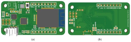 The sensor node main board was designed using Altium Designer software. A compact sensor node design was realized on a two-layer Printed Circuit Board (PCB) with a board dimension of 25 mm × 50 mm, as shown in Figure 5. The surface mount device (SMD) components type was chosen to meet compact and small-size sensor node features.