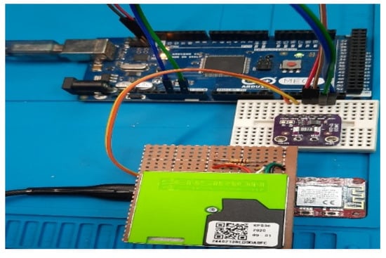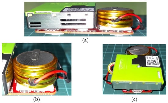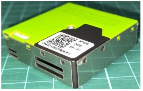 The SPS30 sensor module was integrated with the sensor node board to measure PM2.5 and PM10 concentrations. Sensorion developed the sensor module based on laser scattering technology that allows PM concentration to be measured with high accuracy, reliability, and resolution []. It has small dimensions (41 mm × 41 mm × 12 mm) and is a compact module, as shown in Figure 6.