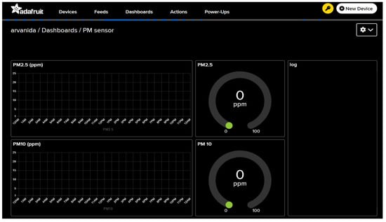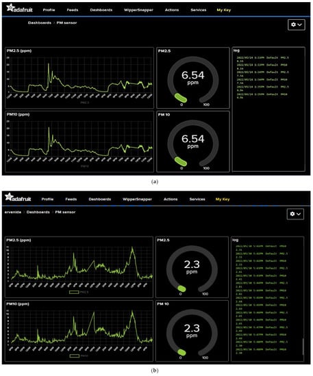 Functionality testing is carried out to see the working functionality of the PM sensor node by the system design. Figure 11a shows the configuration of the system during the functionality testing. The PM sensor node is connected to the IoT core, which uses the Adafruit server. The PM sensor node will be connected to the IoT core through an internet connection and will maintain the connection along the PM sensor node is running. The sensor node is programmed to work in accordance with the algorithm. The PM sensor node is placed on a table inside a room during the testing. The PM sensor node will read the environment PM concentration and transmit the data readings to the IoT core. The user accesses the data stored in the IoT core using a monitoring terminal (a personal computer (PC) or laptop). Figure 11b shows the monitoring dashboard accessed with a PC and displays the PM sensor node readings. All the blocks of data visualization successfully display their functionality. This result confirms that the developed sensor node is successfully running, reading the PM concentration, connecting, and transmitting the data to the IoT core.