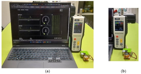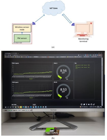 PM sensor functionality testing: (a) configuration; (b) testing process and result.