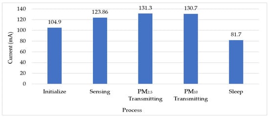 The current measurement result of each process can be seen in Figure 14. The initialization process requires a current of 104.9 mA. In this process, all I/O and interfaces of ATMega4808 are initialized. The initialized interface includes the interface used to communicate with the PM sensor and the Wi-Fi module. In addition, the Wi-Fi module network settings are also initialized in this process. In this stage, the PM sensor node has been connected to the internet network. The current consumption increased in the sensing process to 123.86 mA due to the PM sensor (SPS30) started reading the PM concentration. At this stage, the PM sensor generates two output data values, namely the concentration values of PM2.5 and PM10. After the PM sensor obtains these two parameters, the PM sensor node will stop the reading process and start transmitting PM2.5 and PM10 concentration value data to the IoT core in the next stage. The PM2.5 transmitting stage requires a current of 131.3 mA, and the PM10 transmitting stage requires a current of 120.7 mA. The internet connection and network coverage will determine the current consumption at this stage. This is related to the current consumption needed by the Wi-Fi module, which will increase when the internet connection is bad, and the network coverage is too far. The current measured at this stage is the largest of the entire PM sensor node working process. However, the measured current is significantly reduced to 81.7 mA at the sleep stage. The PM sensor node will activate low-power mode and disable some interfaces on the ATMega4808. At this stage, the measured current is the smallest in the entire PM sensor node working process.