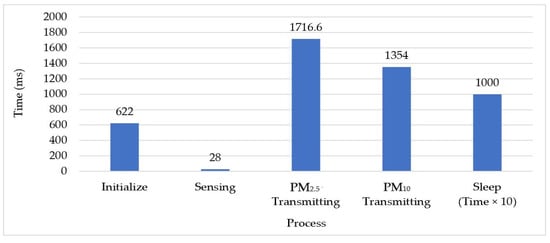 The time measurements were carried out to measure the time requirements for each process in the PM concentration measurement, which is presented in Table 5. The measurement was conducted using a program-based measurement approach. The program measured time consumption based on each process’s start time and stop time in one cycle of PM concentration measurement. The measurement result of time consumption is presented in Figure 15. Each time process, including the initialization process, sensing, PM2.5 transmitting, and PM10 transmitting are 662 ms, 28 ms, 1716.6 ms, and 1354 ms, respectively. In the initialization and sensing processes, the time required is relatively fast compared to the transmitting process due to the operating cycle of ATMega4808 running up to 20 MHz. While transmitting, the time required will be related to the internet connection. A better internet connection takes a faster time to transmit the PM2.5 or PM10 data.